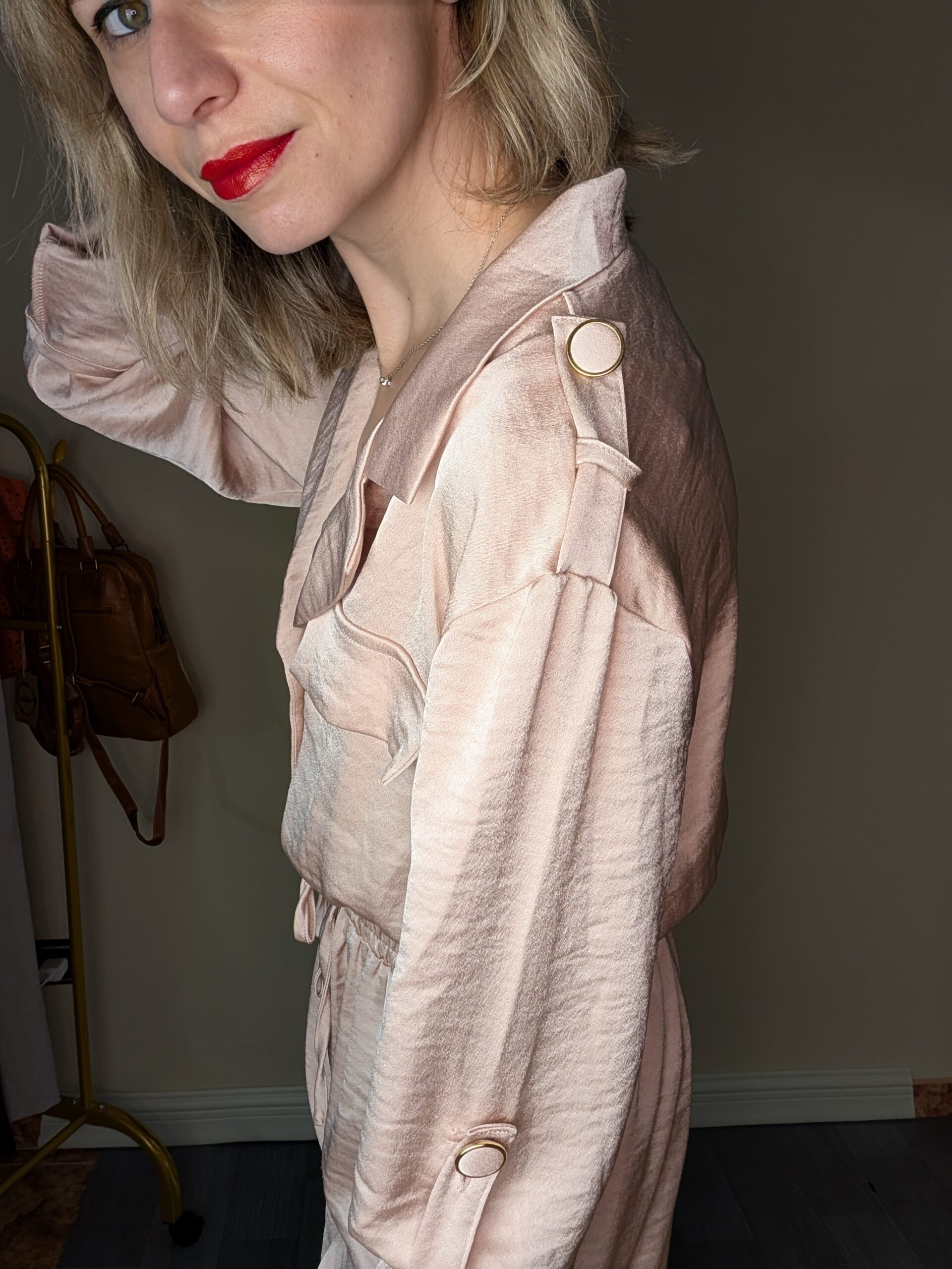 Mono mujer rosa metalizado con botones aterciopelados en color rosa.