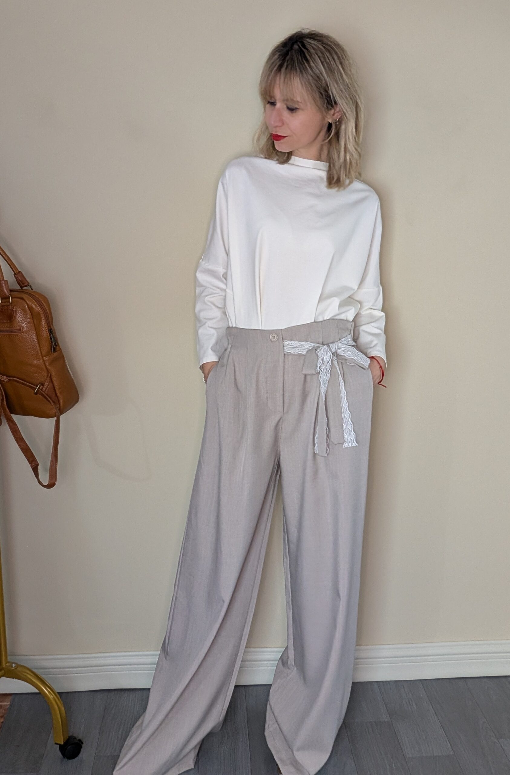 Pantalón palazzo en color gris perlado para mujer con lazo en el lateral decorativo. Pantalón recto y con pinzas para un look mas formal o informal.